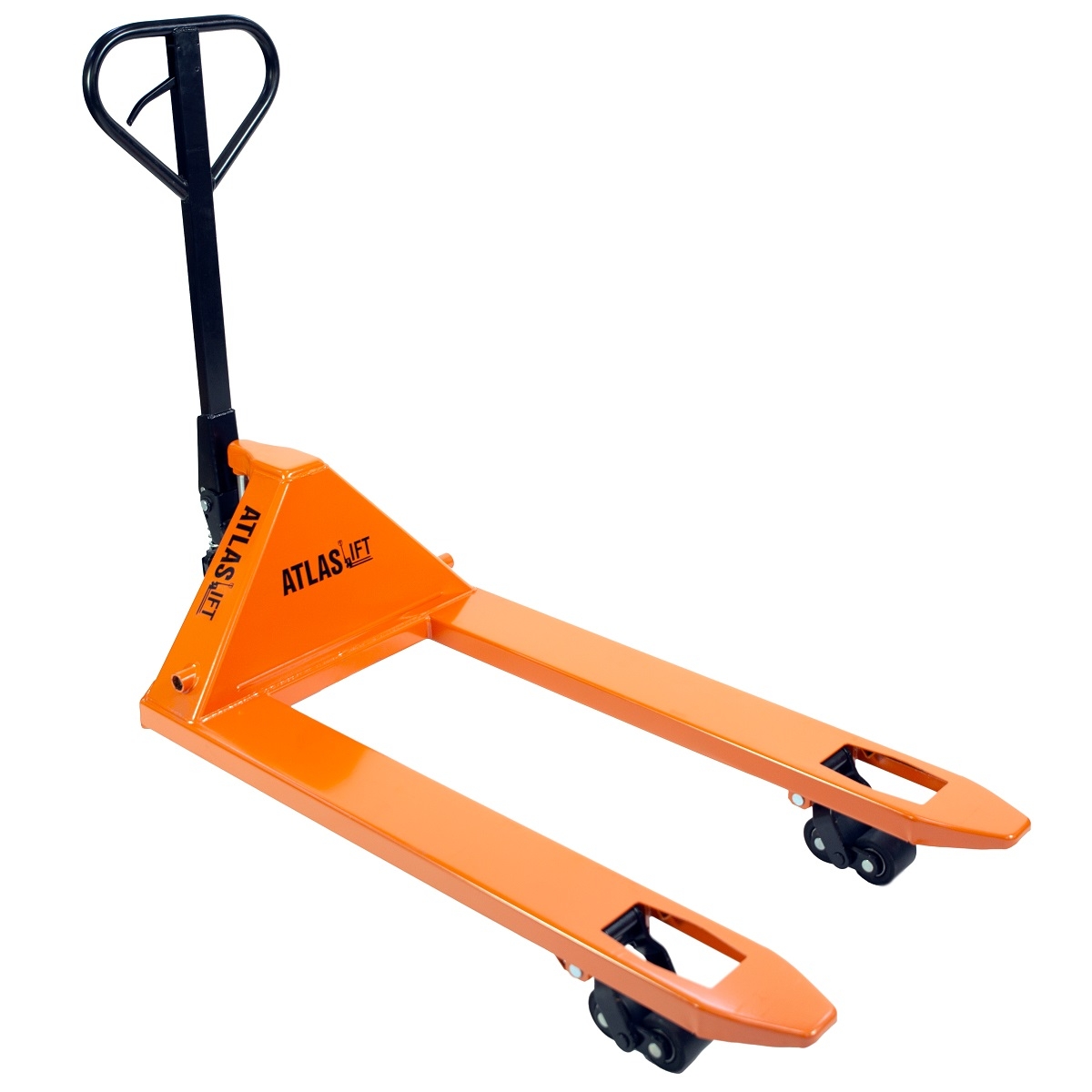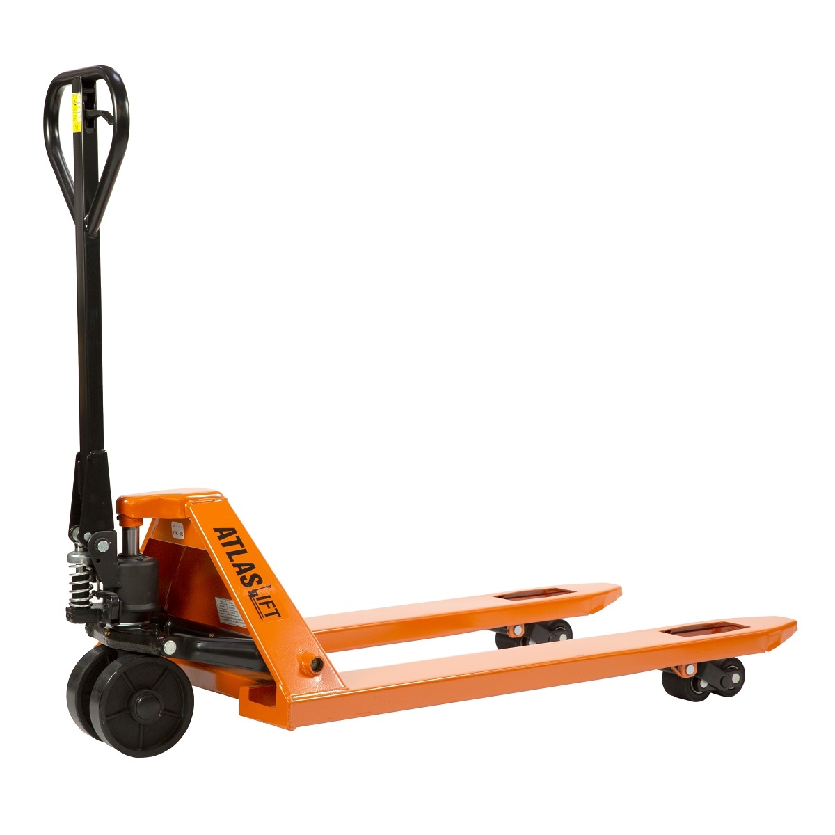 Χειροκίνητο παλετοφόρο με φαρδιά πιρούνια και ρόδες PU. Κατάλληλο για ανύψωση φορτίων έως 2.500kg.