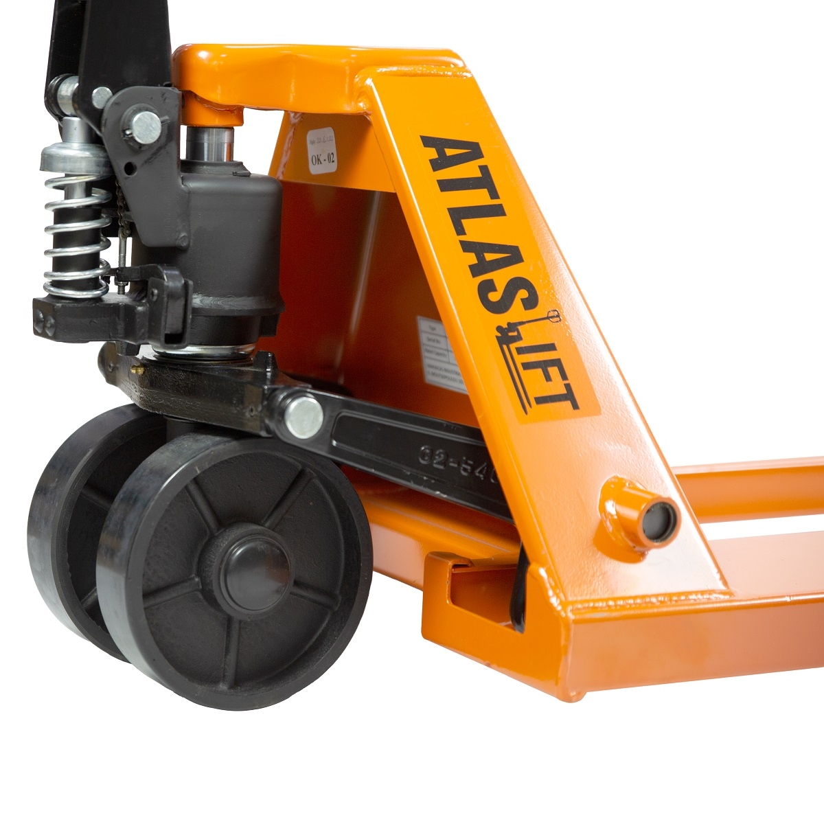 Χειροκίνητο παλετοφόρο πεζού χειριστή με μακριά πιρούνια και ρόδες PU. Κατάλληλο για ανύψωση φορτίων έως 2 τόνους.